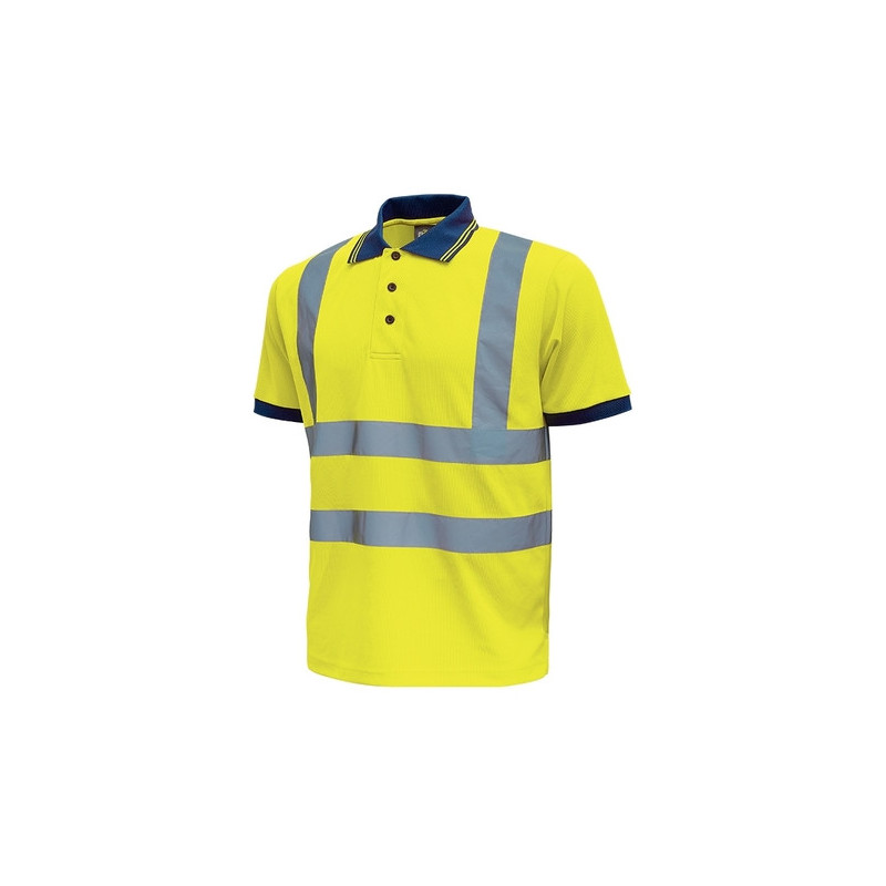 Polo maniche corte con strisce riflettenti applicate. Collo chiuso da tre bottoni.